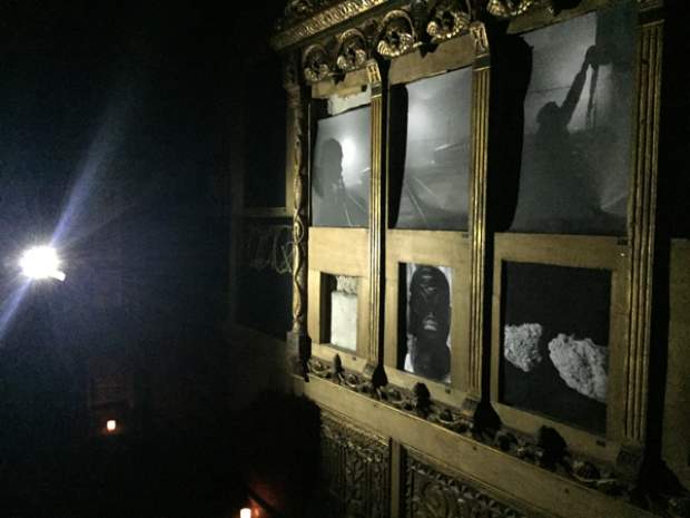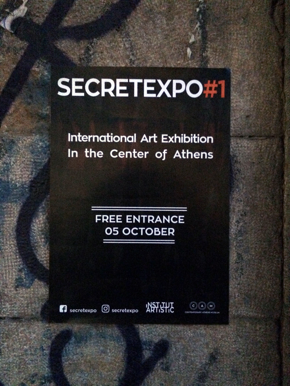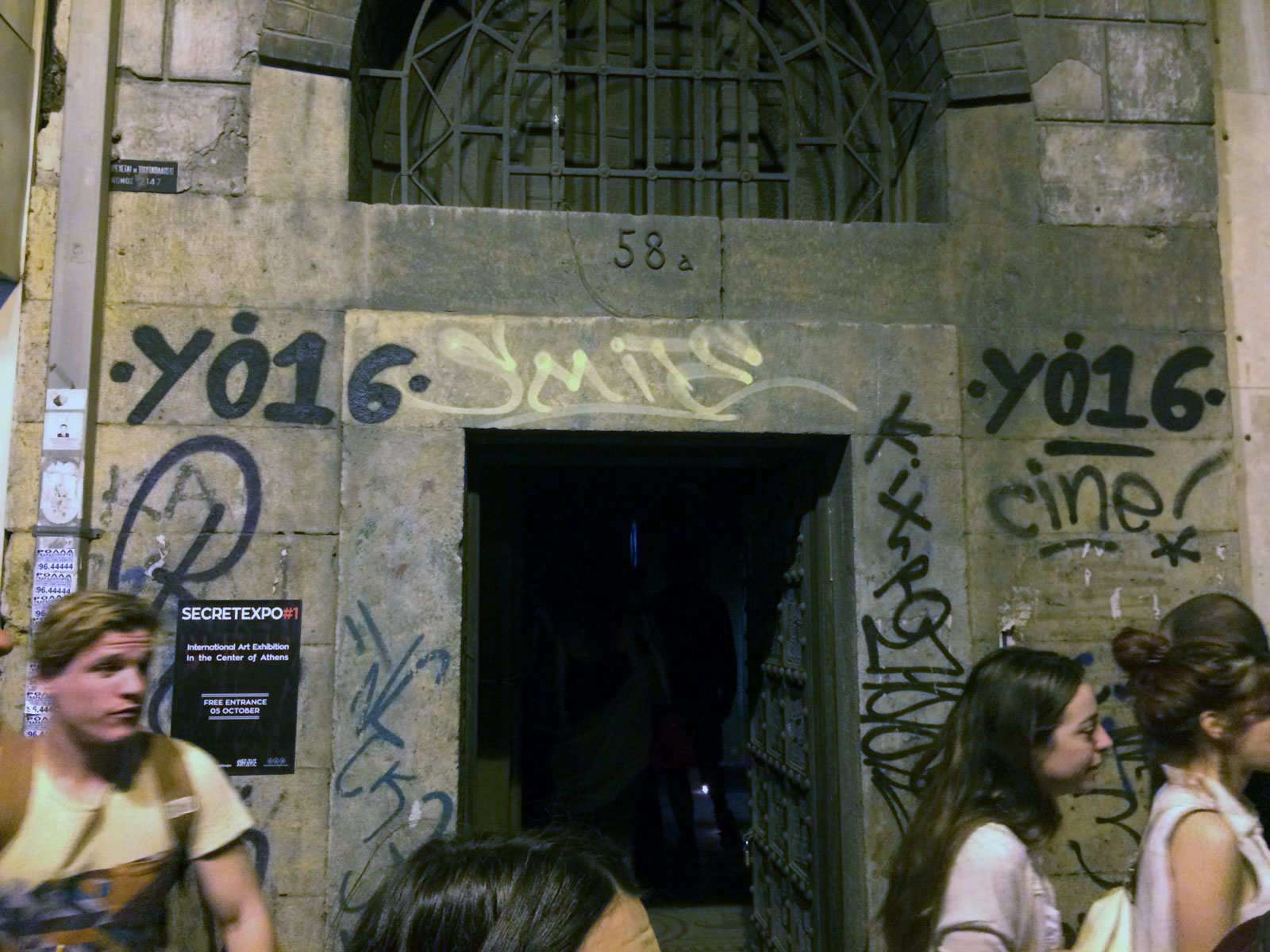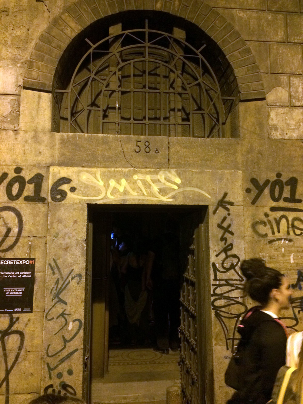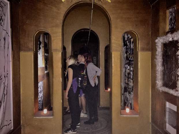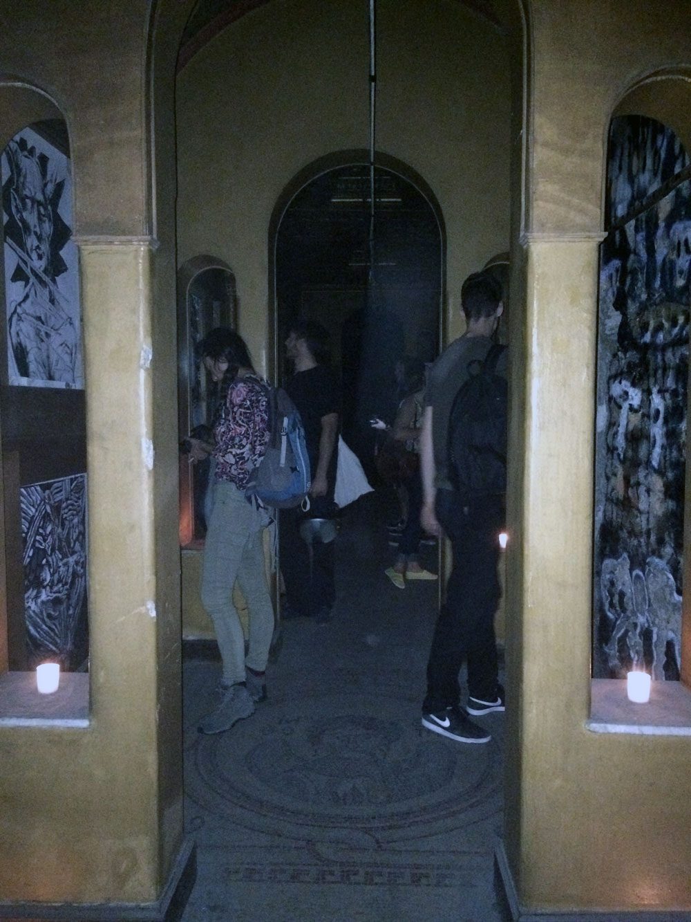 Και ξαφνικά, μια Τετάρτη απόγευμα, άνοιξε τις πόρτες του και μας κάλεσε να το εξερευνήσουμε. Στενό, ψηλοτάβανο, επιβλητικό,ατμοσφαιρικό. Σα να μην ήταν αρκετά μυστηριώδες, μπαίνοντας δεν είχε φώτα, μόνο λίγα ρεσό κεριά δεξιά κι αριστερά. Με το φακό του smartphone στο χέρι οι επισκέπτες κοίταζαν τα βυζαντινά ψηφιδωτά στο πάτωμα, το περίτεχνο ταβάνι και τα περίεργα έργα τέχνης στους τοίχους. Πορτραίτα, σκίτσα, τοιχογραφίες, σε μια εσοχή είχε μια φωτογραφία των Χουντικών, το ένα πιο περίεργο από το άλλο. Στο βάθος μια μαύρη κουρτίνα έκοβε το δρόμο προς το υπόλοιπο κτίριο. Πληροφορίες δε υπήρχαν, στην είσοδο μόνο μια αφίσα του Secretexpo, και μια αναζήτηση στο facebook ενημέρωναν ότι η είσοδος στην έκθεση ήταν δωρεάν για το κοινό, αλλά προσβάσιμη μόνο 19:00-23:00.