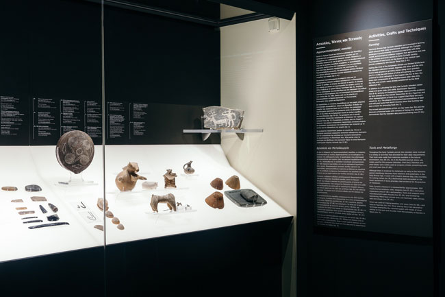 Ο χώρος είναι αρκετά επιβλητικός και αποτελείται από μαύρους τοίχους που συμβολίζουν το σκοτάδι που καλύπτει τις γνώσεις των ιστορικών για την περίοδο εκείνη και μερικές φωτεινές βιτρίνες που περιέχουν τα ειδώλια και τα αντικείμενα και αντιπροσωπεύουν τα σημεία που έχουν καταφέρει να διαφωτίσουν μέσω των ευρημάτων. Μικρά και μεγάλα ειδώλια, καθημερινά χρηστικά ή τελετουργικά σκεύη, συμβολικά αντικείμενα κοινωνικής θέσης αλλά και υλικά, χρώματα, σχέδια χωρίζονται σε πέντε θεματικές ενότητες (1. Πυρήνες της κοινωνίας, 2. Ασχολίες, Τέχνες & Τεχνικές, 3. Μια Ματιά στην Κοινωνική Ζωή, 4. Κοινωνική Ιεραρχία, 5. Πίστεις και Δοξασίες) και αποκαλύπτουν άγνωστες πτυχές της ιστορίας του Πρωτοκυκλαδικού πολιτισμού.