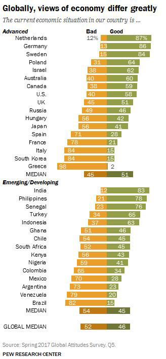 Η έρευνα του Pew Research Center σε γενικές γραμμές αποτυπώνει ότι σχεδόν μία δεκαετία μετά τη μεγάλη κρίση του 2007-2008 η οικονομική εμπιστοσύνη παγκοσμίως έχει αρχίσει να ανακάμπτει. Πολλοί Ευρωπαίοι, Ιάπωνες και Αμερικανοί πλέον εμφανίζονται πιο αισιόδοξοι για την πορεία της οικονομίας, σε αντίθεση με ένα χρόνο. Ωστόσο δεν ξεπερνάει το 46% των ερωτηθέντων στις 32 χώρες, το ποσσοστό των ικανοποιημένων με τις οικονομικές επιδόσεις της χώρας τους.