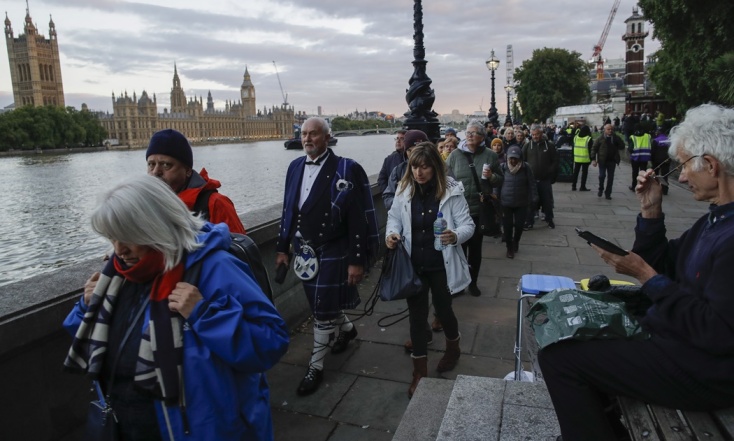 Ο θάνατος της βασίλισσας Ελισάβετ Β’, ιδιαίτερα δημοφιλούς έπειτα από 70 χρόνια στον θρόνο, προκάλεσε μεγάλη θλίψη στη Βρετανία. Η ουρά αναμονής προκειμένου οι πολίτες να προσκυνήσουν το φέρετρό της εκτεινόταν σε πολλά χιλιόμετρα κατά μήκος του Τάμεση χθες Παρασκευή, με τη βρετανική κυβέρνηση να εκτιμά ότι οι πολίτες θα χρειαστεί να περιμένουν περισσότερες από 22 ώρες. Το κοινό μπορεί να αποτίσει φόρο τιμής στην εκλιπούσα βασίλισσα ως τις 06:30 (τοπική ώρα, 08:30 ώρα Ελλάδας) της Δευτέρας.