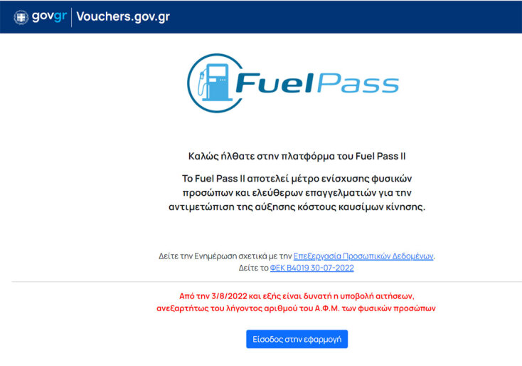Για το Fuel Pass 2 μπορούν πλέον να κάνουν αίτηση όλοι οι δικαιούχοι από σήμερα Τετάρτη 3 Αυγούστου 2022, καθώς η πλατφόρμα vouchers.gov.gr είναι ανοιχτή για όλα τα ΑΦΜ. Ειδικότερα, αίτηση για το Fuel Pass 2 μπορούν να κάνουν όλοι οι ενδιαφερόμενοι ανεξαρτήτως σε τι ψηφίο λήγει ο ΑΦΜ τους.