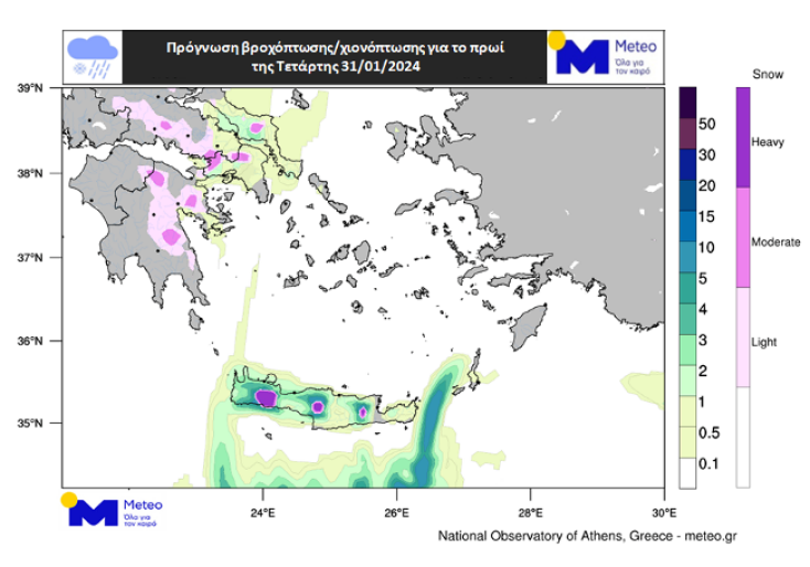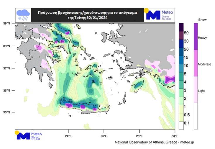 Στους Χάρτες 1 και 2 παρουσιάζεται η βροχόπτωση (πράσινες αποχρώσεις) και η χιονόπτωση (μωβ αποχρώσεις) που αναμένεται το απόγευμα της Τρίτης 30/01 και το πρωί της Τετάρτης 31/01. Στον Χάρτη 3 παρουσιάζεται ο αθροιστικός υετός (βροχή / χιόνι) που αναμένεται την Τρίτη 30/01 και Τετάρτη 31/01.