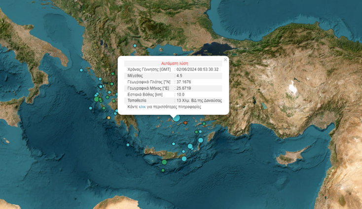 Σύμφωνα με την Αυτόματη Λύση του Γεωδυναμικού Ινστιτούτου, ο σεισμός 4,5 Ρίχτερ καταγράφηκε στη Δονούσα και έγινε αισθητός σε αρκετές περιοχές της Αττικής. Το επίκεντρο του σεισμού εστιάζεται στα 15 χλμ βορειοδυτικά της Δονούσας, με εστιακό βάθος τα 10 χλμ.