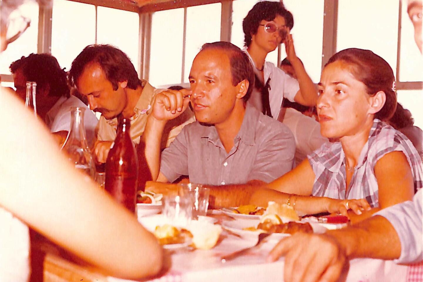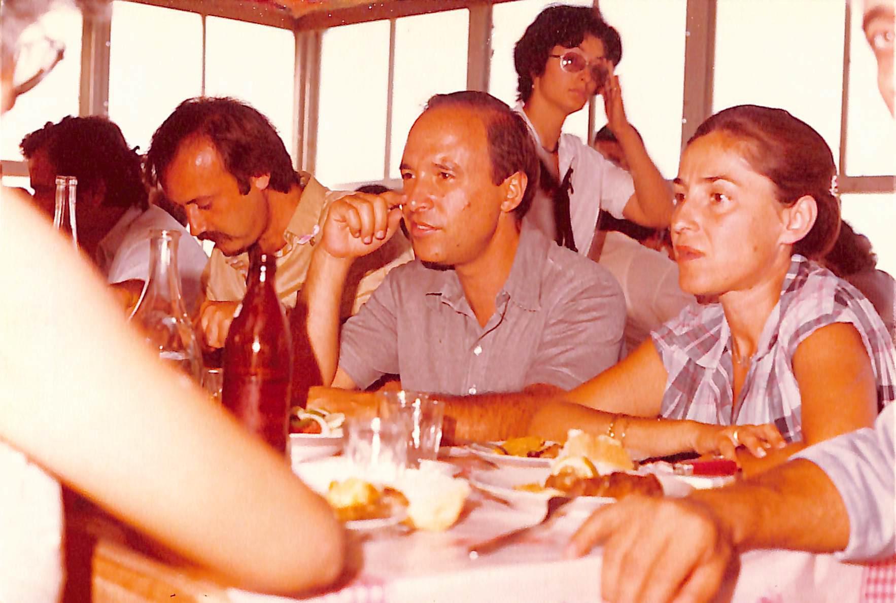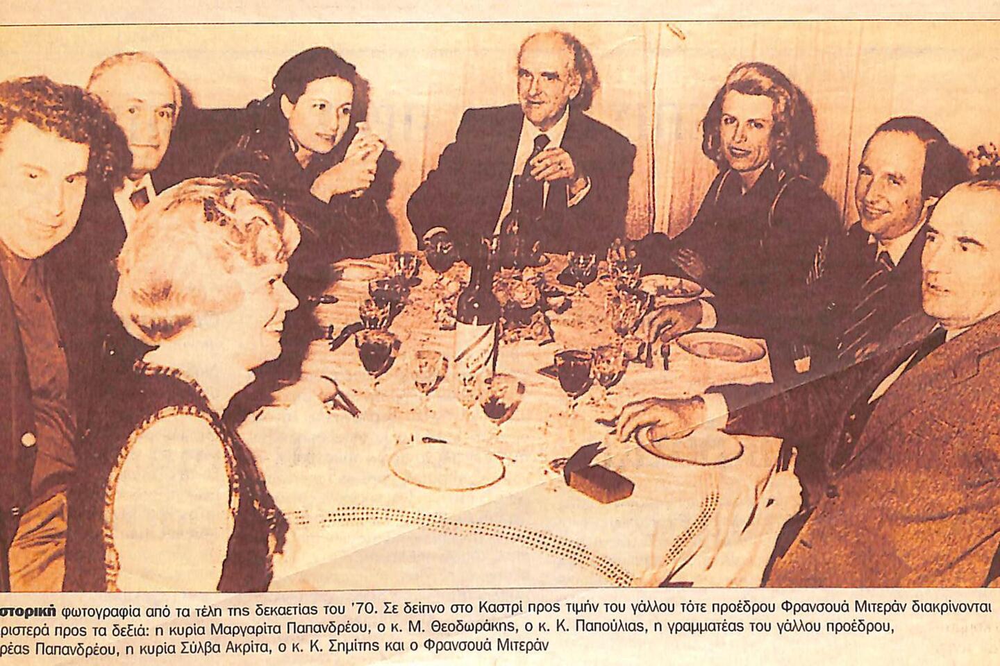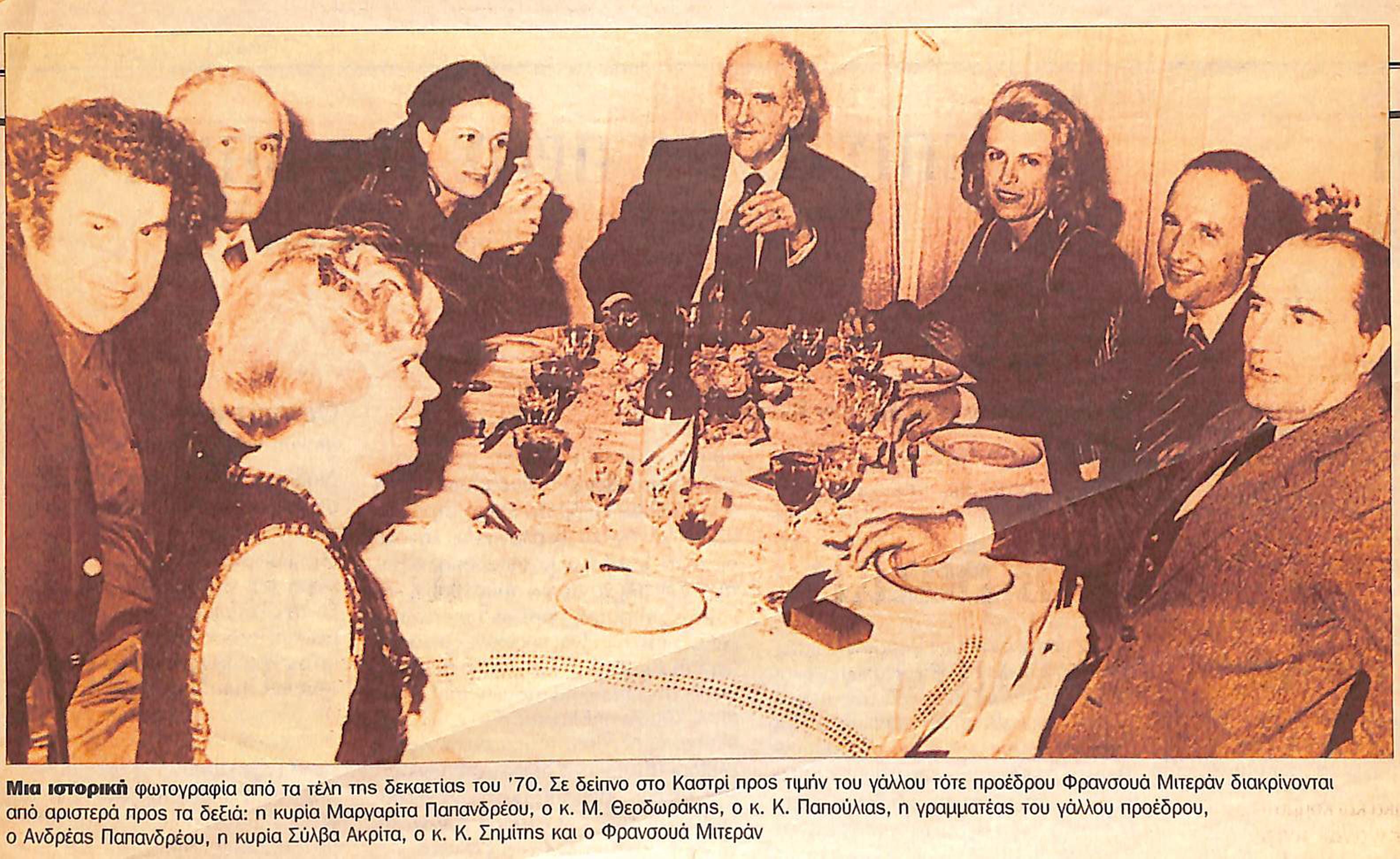 Δείπνο στο Καστρί προς τιμήν του Γάλλου Προέδρου Φρανσουά Μιτεράν (Μαργαρίτα Παπανδρέου - Μ. Θεοδωράκης - Κ. Παπούλιας - Ανδρέας Παπανδρέου - Σύλβα Ακρίτα - Κ. Σημίτης - Φρανσουά Μιτεράν)
