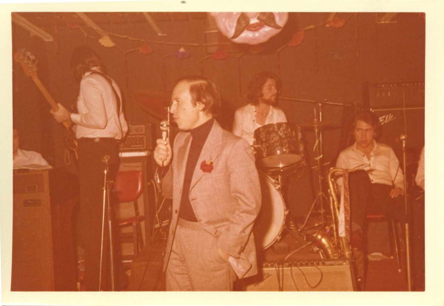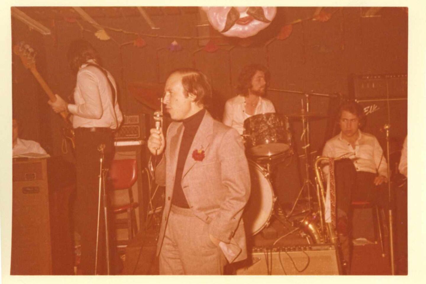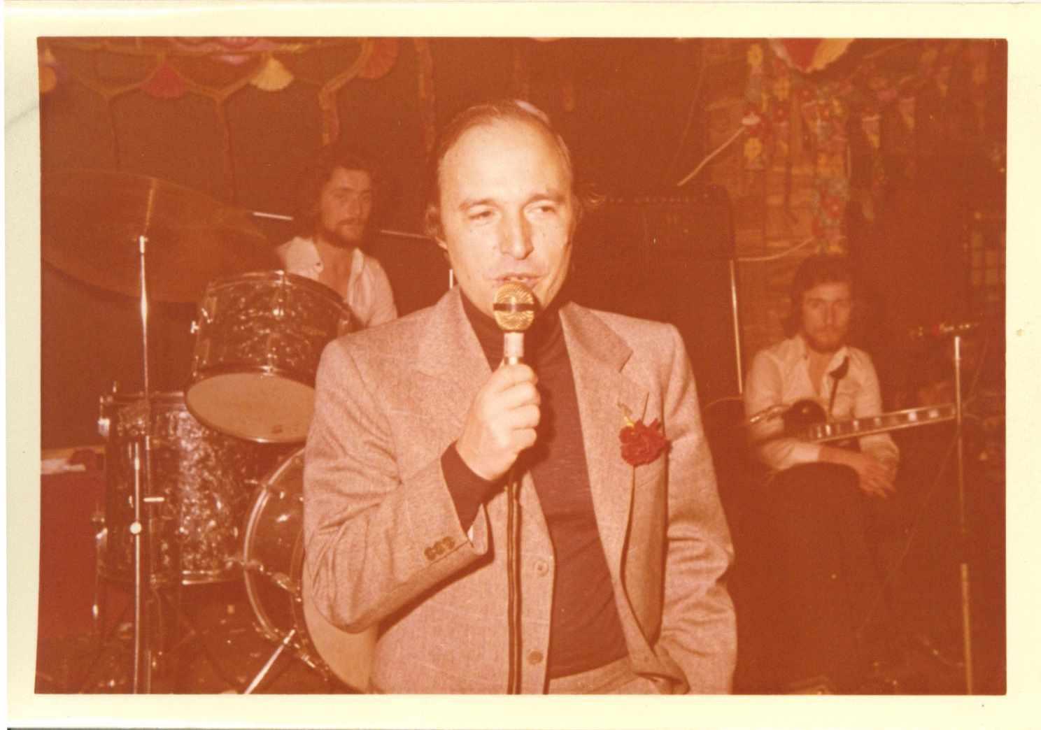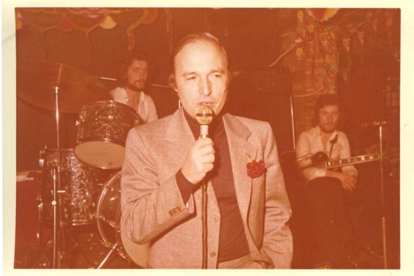 Ο Κώστας Σημίτης με γαρύφαλλο στο πέτο σε μουσική σκηνή © Ίδρυμα Κώστα Σημίτη