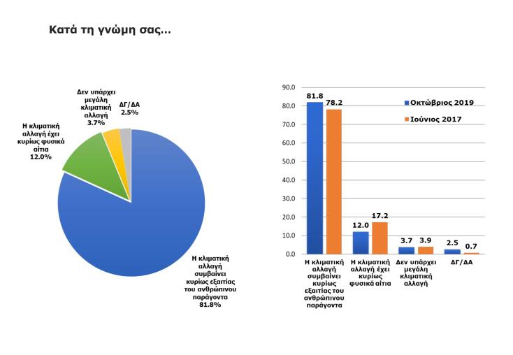 Μια από αυτές αφορούσε τη συζήτηση που γίνεται τελευταία για την κλιματική αλλαγή. Το 81,8% των ερωτώμενων απάντησε ότι αυτή οφείλεται κυρίως στον ανθρώπινο παράγοντα, το 12% ότι έχει κυρίως φυσικά αίτια, ενώ το 3,7% υποστήριξε ότι δεν υπάρχει μεγάλη κλιματική αλλαγή. Τα αντίστοιχα ποσοστά σε έρευνα της ίδιας εταιρείας τον Ιούνιο του 2017 ήταν 78,2%, 17,2% και 3,9%.