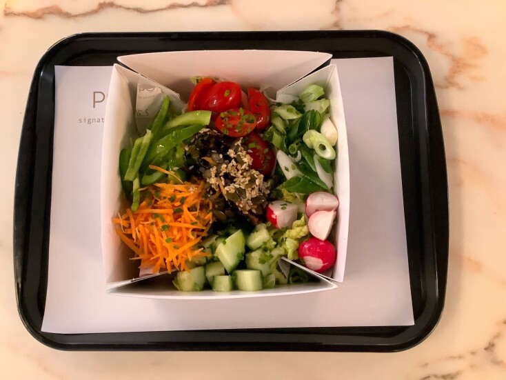 Όλα τα παραπάνω πατατεριέν σικ τα γεύτηκα τσιμπώντας μια δροσερή, γευστική και ούλτρα καλοκαιρινή σαλάτα ονόματι She is a rainbow, με κινόα, δροσερά λαχανικά, φύκια σε ασιατική μαρινάδα, σουσάμι, κολοκυθόσπορο και βινεγκρέτ εσπεριδοειδών.