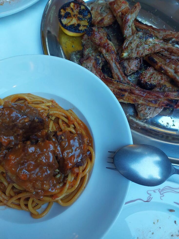 Περάσαμε σε ένα μελωμένο κοκκινιστό αρνάκι με στιβαρό, «σκληρό», παν-τέλεια βρασμένο χοντρό σπαγγέτο (19 ευρώ), με απανωτές πιρουνιές έγινε ανάρπαστο και από τους τρεις μας. Θα μπορούσα κι εδώ να σταματήσω και να …χειροκροτήσω, έλα όμως που η πιατέλα με τα παϊδάκια ακούμπησε στο τραπέζι και με το μάτι και μόνο φανέρωσε τη δύναμή της.