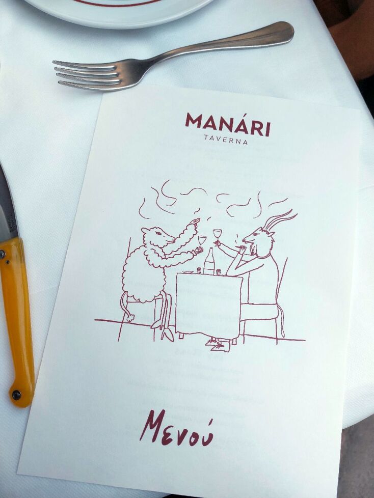 Καθισμένη χτες, μαζί μ’ άλλους δυο φίλους, έξω στο Manari, στις φθινοπωρινές δροσιές της μικρής πλατείας των Αγίων Θεοδώρων, στα τραπέζια με τα λευκά τραπεζομάντηλα και τις ξύλινες σκούρες καφέ καρέκλες παλιάς αστικής αθηναϊκής ταβέρνας, έριξα τις ματιές μου μέσα στις σάλες: τραπέζια δεξιά και αριστερά αλλά και στη μικρή στοά, τραπέζι μεγάλο μπροστά στις φωτιές της ανοιχτής κουζίνας, ένας πιο μόνος του χώρος που φιλοξενεί την κάβα κι ένα μεγάλο μοναδικό τραπέζι -μπορεί να γίνει και πριβέ όπως μαθαίνω. Ωραία, απλά πράγματα, χωρίς πολλά-πολλά στολίδια και φιοριτούρες.