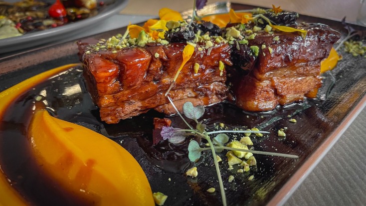 Η σαλάτα με καπνιστή πέστροφα, μεσκλάν, φακή μπελούγκα, μάραθο, ραπανάκι και ντρέσινγκ εσπεριδοειδών σε έναν έξοχο surf and turf συνδυασμό με παντσέτα φούρνου, πουρέ γλυκοπατάτας, φυστίκι Αιγίνης και σάλτσα με αγριοκέρασα, ήταν λογικό να με φέρει σε στοχαστική διάθεση, οπότε αναρωτιέμαι αν και είναι πολύ εύκολη η απάντηση: Τι χέρι, τι αντίληψη και τι κουζίνα είναι αυτή που διακονεί και διακινεί στο Βαρύ Πεπόνι ο κύριος Κωστάκος; Χάρμα.