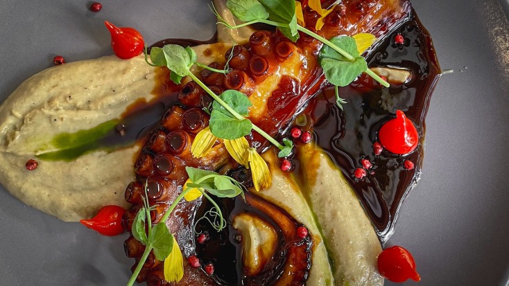 Ο σεφ αυτός είναι τύπος είναι υπογραμμός: οι τσακιστές πατάτες με λάδι τρούφας και στάκα Χανίων, το καραμελωμένο χταποδάκι του με κρέμα μελιτζάνας και η τηγανιά τόνου με άγρια χόρτα, χαρουποπαξίμαδα και σάλτσα σαφράν ευφραίνουν καρδίας.