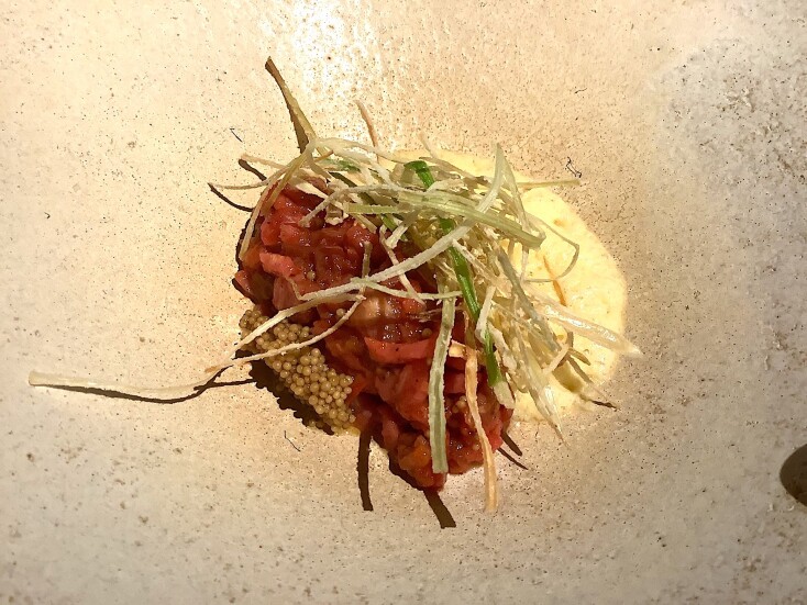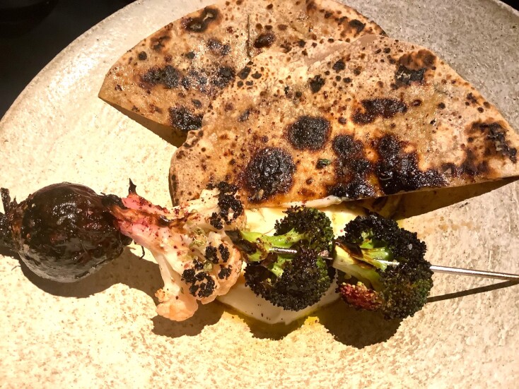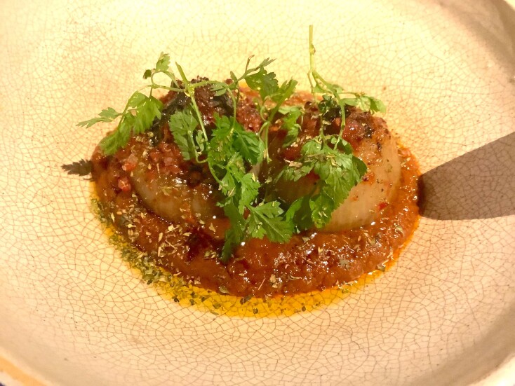 Προζυμένιο ψωμί με αλεύρι ζέας, ροζέ του Σαρρή από την Κεφαλονιά στο ποτήρι κι ένα ταρτάρ μόσχου με σάλτσα αυγού, πίκλα από σινάπι και τσιπς πράσου άλλο να το διαβάζεις κι άλλο να το τρως! Μεγαλειώδης η σύλληψη με τα κρεμμύδια γεμιστά με μοσχαρίσιο κιμά και σταφίδες με σάλτσα παστιτσάδας, όπως και τα λαχανικά στη φωτιά με γλάσο, κρέμα κουνουπίδι και πίτες νάαν.