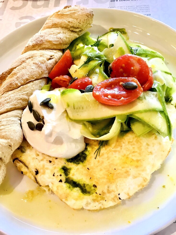 Δοκίμασα το ωραιότατο αβοκάντο τοστ με προζυμένιο ψωμί Θέγια, smashed αβοκάντο, μανιτάρι, λάδι μυρωδικών και φιστίκι Αιγίνης. Εξαίρετη ήταν και η ντελικατέσεν λευκή ομελέτα τους με νιφάδες κολοκυθιού, ντοματίνια, ντρέσινγκ κίτρου, πέστο βασιλικού και φρέσκο κρεμύδι. Επιμύθιο: πήγα για ψωμί και βγήκα χορτασμένος.
