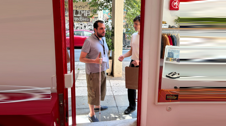 Τι σημαίνει ότι ένα μαγαζί με ρούχα είναι προσβάσιμο σε τυφλά άτομα; «Ότι θα μπορώ να πάω μόνος και θα ξέρω ότι οι άνθρωποι που εργάζονται εκεί θα με εξυπηρετήσουν σωστά», λέει ο Θ. Τσάτσος. «Πολλοί υπάλληλοι νιώθουν μια τρομερή αμηχανία. Κάποιοι σε τραβούν από εδώ κι από εκεί, από το μπαστούνι κάποιες φορές, άλλοι σε σπρώχνουν. Όχι από κακή πρόθεση, αλλά επειδή δεν ξέρουν. Άλλοι σου μιλάνε με τρόπο υπερβολικά ευγενικό, που δείχνει έναν οίκτο. Μπορεί να σου μιλήσουν σαν να ήσουν παιδάκι, όπως “δώστε μου το χεράκι σας να σας κατευθύνω”. Σου έχουνε μιλήσει εσένα έτσι ποτέ; Η φάση όταν ένας υπάλληλος βλέπει έναν τυφλό πελάτη είναι σαν να κολλάει ένας υπολογιστής. Κι εγώ είμαι ένας άνθρωπος κοινωνικοποιημένος, βγαίνω έξω, έχω τις δουλειές μου, τις παρέες μου, κάποιος που δεν είναι έτσι θα έρθει κι εκείνος σε μια μεγάλη αμηχανία, θα νιώσει ότι ενοχλεί, στο τέλος μπορεί και να πει “άστο, κάθομαι σπίτι μου και θα στείλω κάποιον άλλον”. Το θέμα, στο τέλος της ημέρας, είναι και ο υπάλληλος να μην αισθανθεί περίεργα και να ξέρει τι να κάνει κι εγώ να εξυπηρετηθώ σωστά και να φύγω ευχαριστημένος, όπως κι εσύ όταν πηγαίνεις για να κάνεις τα ψώνια σου».