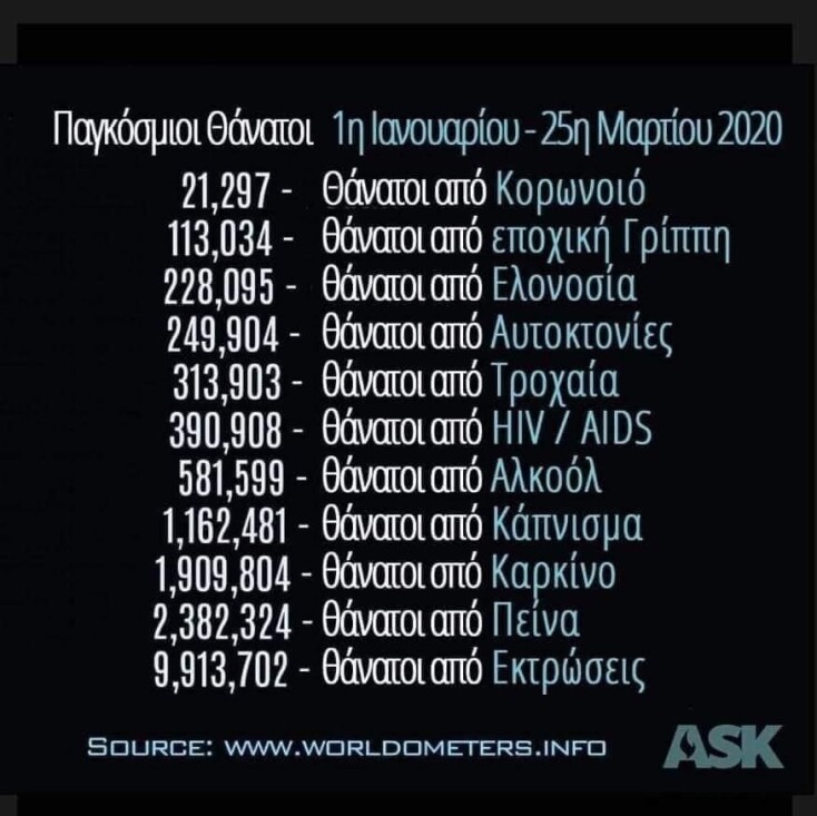 Πριν λίγες ημέρες κυκλοφόρησε στο διαδίκτυο και ιδίως στα μέσα κοινωνικής δικτύωσης ένας πίνακας με τον αριθμό των θανάτων παγκοσμίως, από την αρχή του έτους, ανά αιτία θανάτου. Ο πίνακας αναγράφει ότι οι θάνατοι μεταξύ 1.1.2020 και 25.3.2020 από τον κορωνοϊό είναι 21.297, ενώ οι θάνατοι από εποχική γρίπη, στο ίδιο χρονικό διάστημα, είναι 113.034 (5,5 φορές περισσότεροι) και από ελονοσία 228.095 (11 φορές περισσότεροι). Ακόμα μεγαλύτεροι αριθμοί θανάτων αποδίδονται σε άλλες αιτίες, με μεγαλύτερο τον αριθμό των θανάτων που οφείλονται στην πείνα (πάνω από 2 εκατομμύρια). Παραλείπω συνειδητά να συμπεριλάβω στη σύγκριση αυτή τις σχεδόν 10 εκατομμύρια εκτρώσεις που εντελώς άστοχα συμπεριλαμβάνονται στον ίδιο πίνακα.
