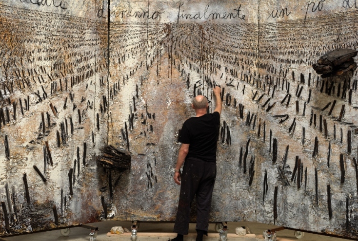 Στην εμβληματική Sala dello Scrutinio, την αίθουσα όπου εκλέγονταν οι άρχοντες της Γαληνοτάτης και κοσμούν τοιχογραφίες που υμνούν το μεγαλείο της, έρχεται να βάλει την πινελιά του ο Γερμανός ζωγράφος από τις 20/4 έως τις 29/10. Μεγάλη πρόκληση, αν σκεφτεί κανείς πως το παλάτι των Δόγηδων έχουν αφήσει το στίγμα τους δημιουργοί του διαμετρήματος των Μπελίνι, Τιτσιάνο, Βερονέζε και Τιντορέτο. Τον Κίφερ προσκάλεσε να καταθέσει αυτή την επιτόπια ζωγραφική εγκατάσταση το Ίδρυμα Αστικών Μουσείων της Βενετίας με το σκεπτικό να γίνουν οι δημόσιοι χώροι της ιστορικής πόλης «μάρτυρες της εποχής μας και να συνομιλήσουν με το παρόν και τις παγκόσμιες αξίες του». Ο τίτλος «Questi scritti, quando verranno bruciati, daranno finalmente un po’ di luce» (σε ελεύθερη μετάφραση «Αυτά τα γραπτά, όταν καούν, τελικά θα ρίξουν λίγο φως») προέρχεται από το έργο του φιλοσόφου Αντρέα Έμο (1901-1983) που για τους επιμελητές παρουσιάζει «εντυπωσιακές αναλογίες» με αυτό του καλλιτέχνη. Σημείο εκκίνησης, πάντως, για τον ζωγράφο θα αποτελέσει και η μοναδική γεωγραφική θέση της Βενετίας και οι πολιτισμικές αλληλεπιδράσεις που έχει ενεργοποιήσει.