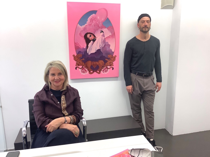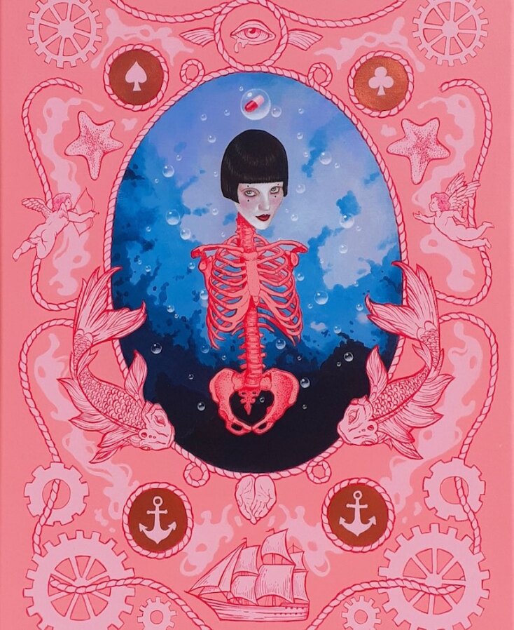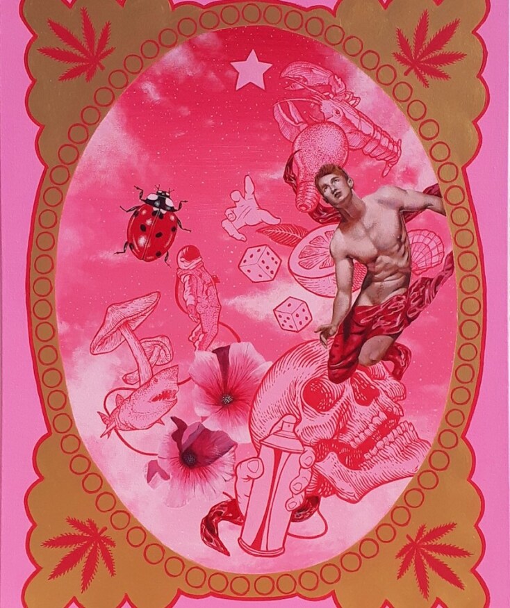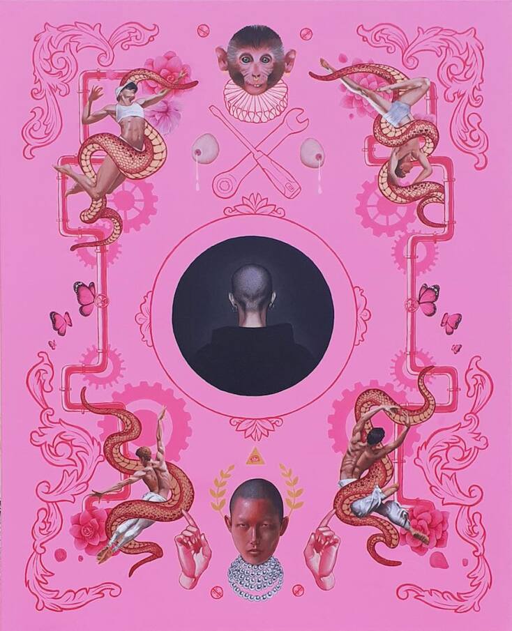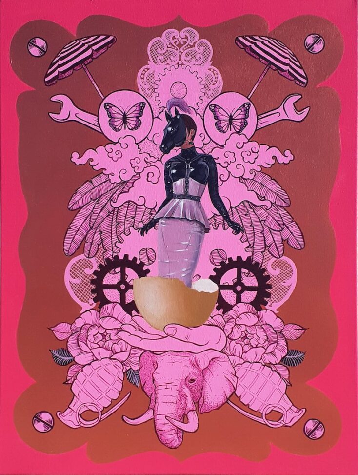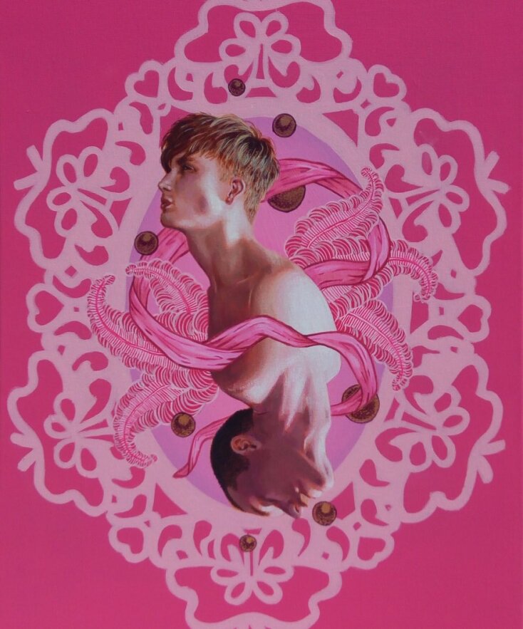 Ροζ που θα το ζήλευε και ο Ροζ Πάνθηρας αλλά και οι Pierre et Gilles. Βέβαια μέσα καραδοκούν και ο Πικάσο, και ο Τιμ Μπάρτον, και ο Μαγκρίτ, και το Βυζάντιο, και η Μαντόνα με τον Γκοτιέ, τα μπουρλέσκ θεάματα και τα κορίτσια με τα γένια στα πάλαι ποτέ περιοδεύοντα τσίρκα. Βάζω μέσα και τον ποπ γκόθικ σουρεαλισμό του Μαρκ Ράιντεν. Υπάρχει μια αχρονία αλλά εντέχνως σε αυτούς τους πίνακες λάμπει και μια πολύ συγκεκριμένη, επίσης, επιταγή ως προς το gender fluid που εκπέμπουν: διαβάζω καλά ή κάνω λάθος; Και αν ναι, ποιο είναι το μήνυμα, Σταμάτη;