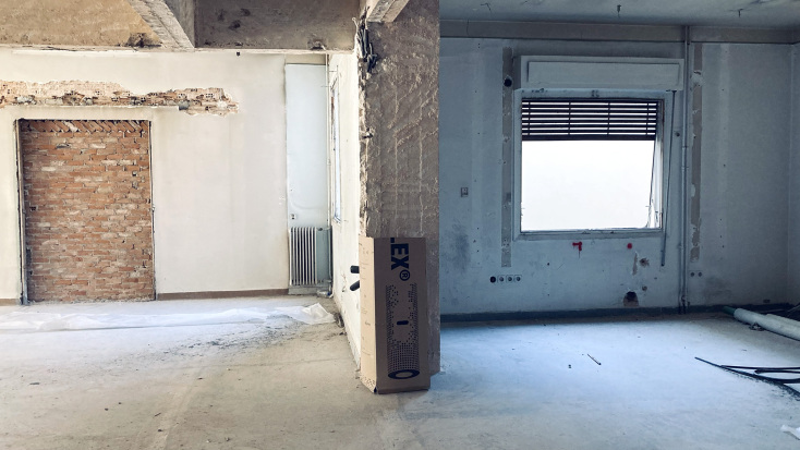 Το διαμέρισμα των 284,70 τ.μ., όπου θα πραγματοποιηθεί η έκθεση, ανήκει στη γερμανική εταιρεία Ehret+Klein, η οποία την ερχόμενη άνοιξη θα ξεκινήσει τις εργασίες ανακαίνισης ώστε να το αναβαθμίσει και να το μεταμορφώσει σε ένα πράσινο βιοκλιματικό σπίτι. Σήμερα, τα σημάδια της μακράς και ποικίλης χρήσης του χώρου είναι ορατά σε κάθε γωνιά, στους τοίχους, στα ταβάνια μέχρι και στα κουφώματα. Ουσιαστικά, το μέχρι πρότινος εγκαταλελειμμένο διαμέρισμα βρίσκεται σε μια διαδικασία μετάβασης αναζητώντας τη μελλοντική του ταυτότητα.