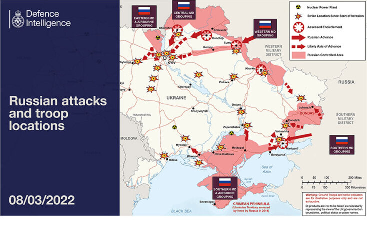 Την ίδια στιγμή στην πόλη Σούμι, ο κυβερνήτης της περιοχής είπε ότι στην επιχείρηση εκκένωσης της ομώνυμης πρωτεύουσας της επαρχίας μέχρι στιγμής έχουν απομακρυνθεί περίπου 3.500 άμαχοι. Ακολουθεί ο επικαιροποιημένος χάρτης των βομβαρδισμών και των μαχών στην Ουκρανία που δημοσίευσε το βρετανικό Υπουργείο Άμυνας για την 13η ημέρα από τη ρωσική εισβολή.