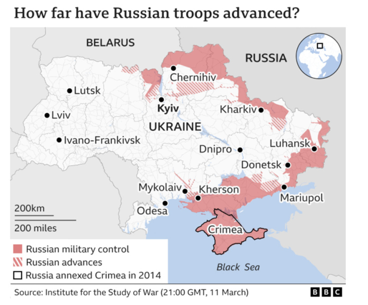 The map below is the latest Defence Intelligence update on the situation in Ukraine - 12 March 2022