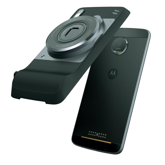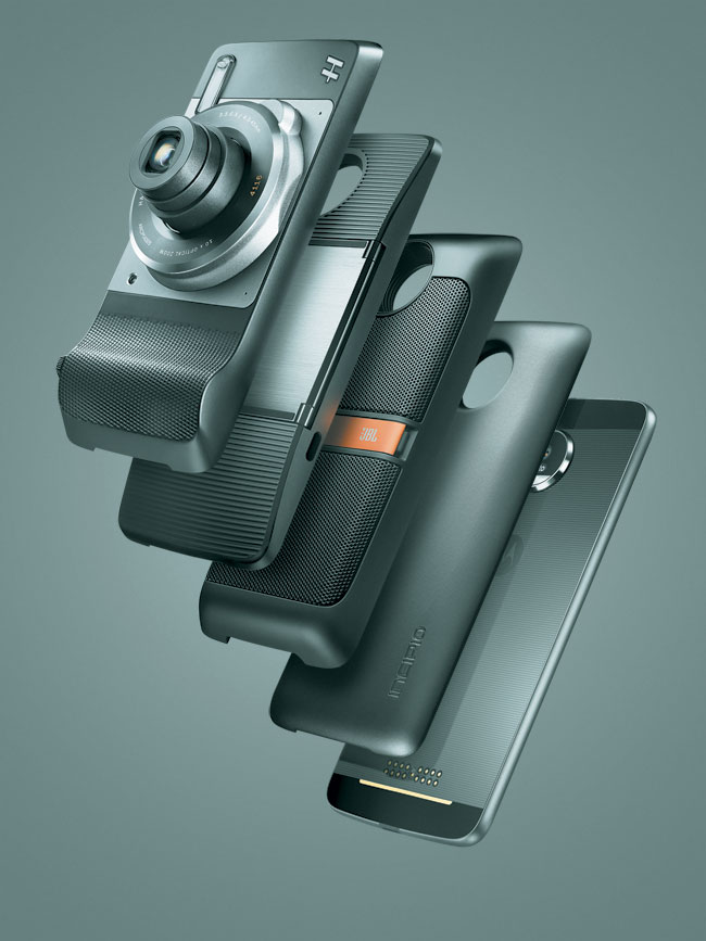 Τα Moto Mods είναι τέσσερα και φυσικά η οικογένεια πρόκειται μελλοντικά να μεγαλώσει με νέες δυνατότητες και επεκτάσεις. Το Moto Mod Incipio off GRID™ Power Pack προσθέτει έως και 22 ώρες ζωής στη μπαταρία του κινητού για να μην ξεμένεις ποτέ. Το Hasselblad True Zoom Moto Mod προσθέτει στη στιγμή προηγμένες δυνατότητες φωτογραφίας στη συσκευή, το χαρακτηριστικό 10x Optical Zoom και Xenon φλας εγγυώνται την τέλεια λήψη, ενώ χάρη στον μη αυτοματοποιημένο φακό και έλεγχο ζουμ θα έχεις πάντα τον απόλυτο χειρισμό της κάμερας. Δύο ενσωματωμένα ηχεία 3W στο JBL SoundBoost Moto Mod με αυτονομία 10 ωρών μετατρέπουν το κινητό σου σε μίνι στέρεο με υψηλής ποιότητας ήχο. Το Insta-Share Projector Moto Mod μετατρέπει κάθε επιφάνεια σε οθόνη 70” για να απολαμβάνεις τα αγαπημένα σου βίντεο, ταινίες και φωτογραφίες. Και φυσικά, με τα Moto Style Shells, αλλάζεις το χρώμα του πίσω μέρους του smartphone σου, όποτε θες και το προσαρμόζεις στο προσωπικό σου στιλ.
