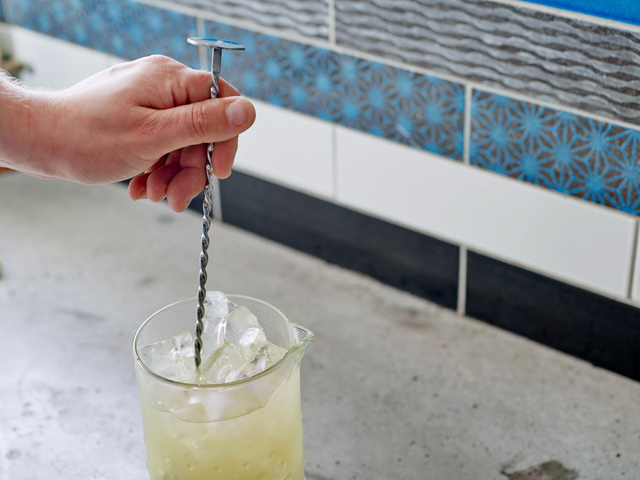 Γεμίστε το mixing glass με όλο το υγρό που χρειάζεται ανακάτεμα και προσθέστε πάγο. Αν χρησιμοποιείτε bar spoon, κρατήστε το μεταξύ του αντίχειρα και του δείκτη και εισάγετε το κουτάλι μεταξύ του ποτηριού και του πάγου, ακουμπώντας την εξωτερική πλευρά του κουταλιού στην άκρη του mixing glass. Αρχίστε το ανακάτεμα, χρησιμοποιώντας τα δάχτυλά σας για να στριφογυρίσετε το κουτάλι (αντισταθείτε στον πειρασμό να χρησιμοποιήσετε τους αγκώνες σας) και αφήστε τον πάγο να σας δώσει ώθηση για να αυξήσετε την ταχύτητα.
