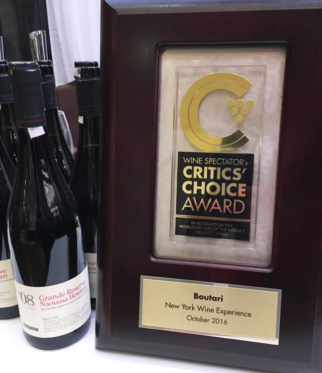 Tο Grand Reserve Naoussa Boutari 2008 ήταν φέτος το μοναδικό ελληνικό κρασί ανάμεσα σε 250 από 15 χώρες που απέσπασε το Wine Spectators Critics’ Award, στο Grand Tasting του New York Wine Experience, ένα μοναδικό παγκόσμιο οινικό γεγονός που καθιερώθηκε ως ετήσιος θεσμός για τους επαγγελματίες και καταναλωτές.
