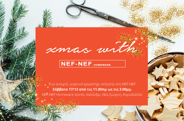 Μοιράζοντας το κέφι, την αισιοδοξία και το πνεύμα Χριστουγέννων, τα τρία NEF-NEF Homeware monobrand stores, στην καρδιά του Χαλανδρίου, της Νέας Σμύρνης και του Κορυδαλλού, μεταμορφώνονται για 4 ώρες σε Xmas workshops, προσκαλώντας μικρούς και μεγάλους επισκέπτες να αφεθούν και να απολαύσουν τη χαρά του παιχνιδιού και της δημιουργίας.