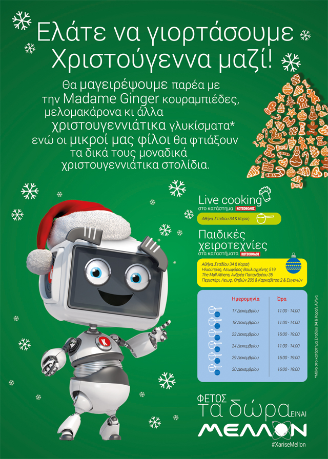 Στο νέο κατάστημα της Σταδίου στον ειδικά διαμορφωμένο χώρο «Ελάτε Σπίτι μας» μπορούν όλοι οι επισκέπτες να απολαύσουν «γλυκά μαγειρέματα» με τη διακεκριμένη food blogger Madame Ginger (Μαριλού Παντάκη). Μελομακάρονα, κουραμπιέδες και εναλλακτικές παραλλαγές τους θα παρουσιαστούν βήμα-βήμα, ενώ η γνωστή δημιουργός θα δώσει μοναδικές συμβουλές για το εορταστικό σας τραπέζι.