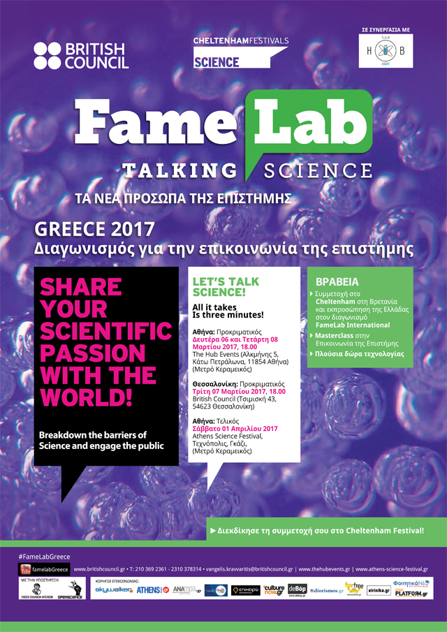 Το British Council, σε συνεργασία με το Hub Science, διοργανώνουν τον διεθνή διαγωνισμό FameLab, θέλοντας να αναδείξουν για ενδέκατη συνεχή χρονιά τα νέα ταλέντα στην επικοινωνία της επιστήμης. Ο διαγωνισμός έχει δώσει την ευκαιρία σε δεκάδες νέους να μοιραστούν το πάθος τους για τo «άνοιγμα» της επιστήμη στο ευρύ κοινό και να ξεχωρίσουν για την επικοινωνιακή τους δεινότητα. Ελάτε να ζήσετε μια μοναδική εμπειρία!
