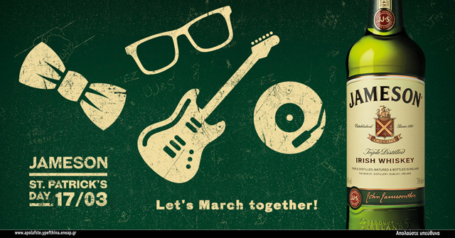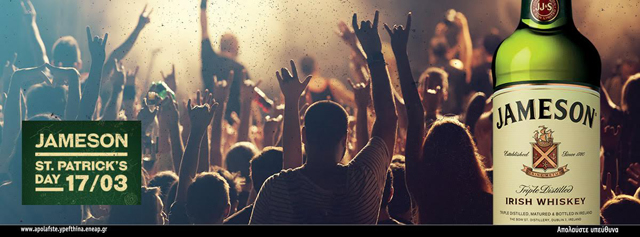 Το Jameson Irish Whiskey, το Νο.1 ιρλανδέζικο whiskey παγκοσμίως, ετοιμάζεται για τον εορτασμό του St. Patrick’s Day, και δίνει …πράσινο χρώμα στη διασκέδασή σου, με τον πιο Jameson τρόπο. Από τις αρχές Μαρτίου, και με αποκορύφωμα την Παρασκευή 17 Μαρτίου αναζήτησε τα Jameson St. Patricks’ events σε Αθήνα και Θεσσαλονίκη, πάρε την παρέα σου, βάλε τη χαλαρή σου διάθεση και κάτι πράσινο (θα φροντίσει και το Jameson γι’ αυτό!), ετοιμάσου για μοναδικές εμπειρίες και ζήσε την ατμόσφαιρα της μεγαλύτερης Ιρλανδέζικης γιορτής! Μάθε περισσότερα για τα parties του Jameson St.Patrick’s Day σε Αθήνα και Θεσσαλονίκη, στην επίσημη Facebook σελίδα του Jameson Irish Whiskey.