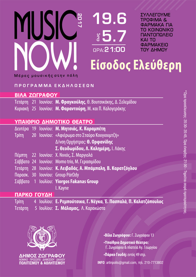 Ο μουσικός θεσμός – Φεστιβάλ «ΜUSIC NOW!» που διοργανώνει στην πόλη του Ζωγράφου για τρίτη συνεχή χρονιά το ΝΠΔΔ Πολιτισμού και Αθλητισμού Δήμου Ζωγράφου, απολαμβάνει πλέον την στήριξη χιλιάδων πολιτών και πολλών καλλιτεχνών ευρέος φάσματος που πίστεψαν στη νέα πρόταση για την αναβάθμιση του πολιτιστικού τοπίου της πόλης. Ένα μουσικό γεγονός που αγκαλιάστηκε με ενθουσιασμό από πολίτες όλων των ηλικιών και κυρίως από τη νεολαία.