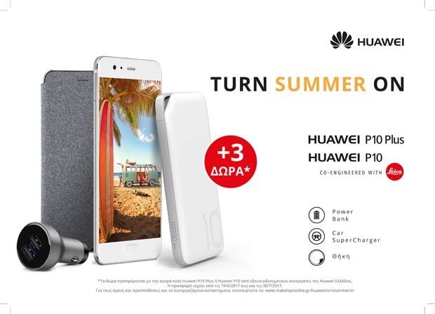 Η Huawei γιορτάζει την έναρξη του καλοκαιριού προσφέροντας δώρα που κανείς δεν πρέπει να χάσει. Με την αγορά συσκευών Huawei P10 και P10 Plus το διάστημα από τις 19/6 έως και 30/7, η Huawei συμπληρώνει την αγορά σου με μοναδικά αξεσουάρ για το νέο σου κινητό.