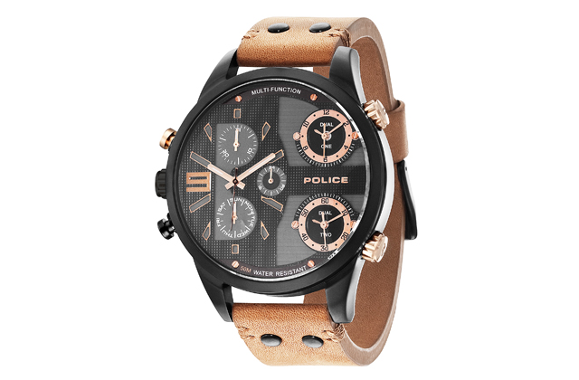 Ρολόι με δερμάτινο καφέ λουράκι, καντράν μαύρο, Multifunction, τριπλή ένδειξη ώρας, ημερομηνία, €219