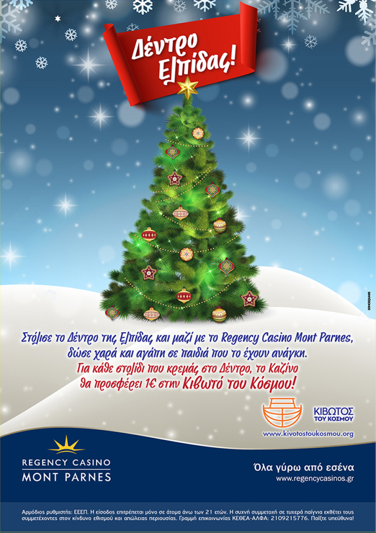 Το Regency Casino Mont Parnes φέτος δεν θα στολίσει ένα απλό χριστουγεννιάτικο δέντρο, αλλά το «Δέντρο της Ελπίδας», επιδιώκοντας με αυτόν τον τρόπο να προσφέρει χαρά και αγάπη σε παιδιά που το έχουν πραγματικά ανάγκη.