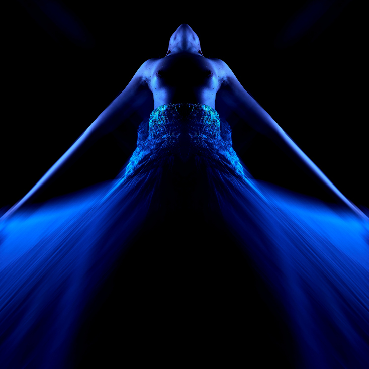 Αποφάσισα να ξεκινήσω από την επιλογή της χρωματικής παλέτας, κινήθηκα στο ψυχρό μπλε λόγω της έλλειψης θερμότητας στο σύμπαν, αλλά μου έλειπε ένα βασικό στοιχείο η κίνηση, και πως αυτή θα επιτευχθεί στο studio χωρίς την χρήση photoshop ή μέσω φωτογραφικής τεχνικής long exposure, γιατί ο σκοπός ήταν η σημειακή, επιλεκτική κίνηση. To άφησα λίγο στην άκρη λοιπόν για να σκεφτώ το φως και την τεχνική, κατέληξα στο low key σε πρώτη φάση, τονικότητες από 0 έως 5 του ζωνικού συστήματος από τον δάσκαλο Αnsel Αdams. Το αποτέλεσμα του πειραματισμού ήταν, εξαιτίας του λευκού φορέματος να εμφανιστούν και οι ζώνες 7