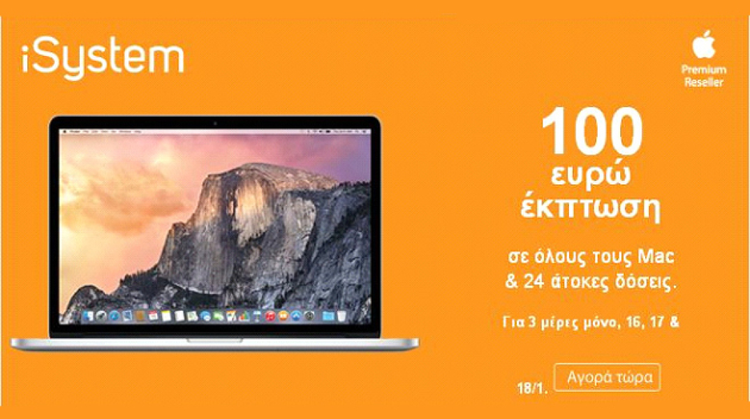Αγοράστε το δικό σας υπολογιστή Mac στις 16, 17 και 18 Ιανουαρίου από την iSystem, με έκπτωση 100€ & 24 άτοκες δόσεις. Bρείτε το Mac που σας ταιριάζει και επωφεληθείτε της προσφοράς σε ένα από τα καταστήματα στο Χαλάνδρι (Μεσογείων 269) ή στα Σπάτα (SmartPark) καθώς και στο ηλεκτρονικό κατάστημα store.i-system.gr