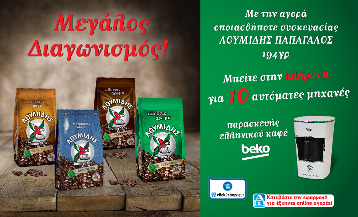 Πάμε τώρα στην αρχή για να δώσουμε ένα καλό τέλος στην ιστορία και στη μέρα σου. Βρισκόμαστε στο σημείο όπου κρατάς το μπρίκι και ονειρεύεσαι τη μυρωδιά του αγαπημένου σου Λουμίδη Παπαγάλου. Αυτή τη φορά όμως, αντί να πας στο γραφείο χωρίς να έχεις πιει καφέ, έχεις τη δυνατότητα να πιάσεις το κινητό σου και να επιλέξεις από την εφαρμογή AB Click2Shop την αγαπημένη σου συσκευασία Λουμίδης Παπαγάλος. Παραδοσιακό, Κουπάτο, Σκούρο ή Αρχοντικό, ό,τι κι αν προτιμάς είναι εδώ! Και μάλιστα, με την αγορά οποιασδήποτε συσκευασίας 194 γρ., μέσα από την εφαρμογή, κερδίζεις αυτόματα μια συμμετοχή για την κλήρωση που θα αναδείξει 10 τυχερούς, οι οποίοι και θα κερδίσουν από μια αυτόματη μηχανή παρασκευής ελληνικού καφέ Beko.