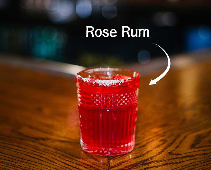 Rose Rum: Havana Club Añejo 3 Años, Triple Sec, φράουλα, τριαντάφυλλο και πικραμύγδαλο.