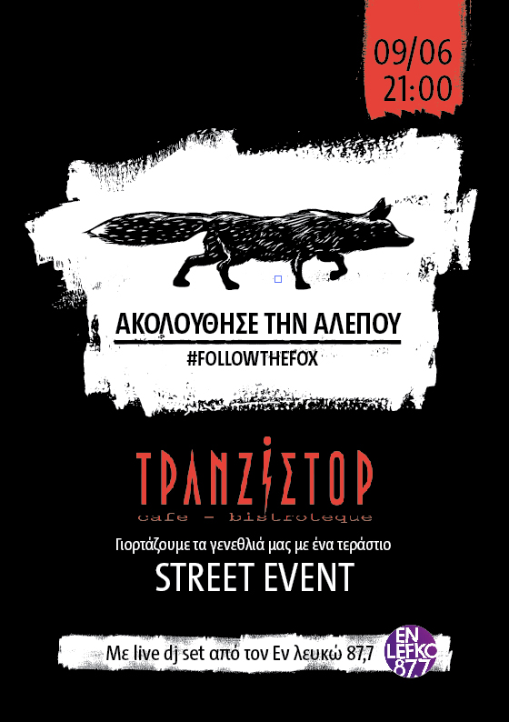 Για να το ανακαλύψουμε όλοι μαζί, ραντεβού την Παρασκευή 9 Ιουνίου στην μεγάλη γιορτή για τα 7 χρόνια του αγαπημένου μας Τρανζίστορ, στις 21.00. Μας περιμένει live dj set και επιτέλους η αποκάλυψη για το ποιος έχει γεμίσει αλεπούδες τους δρόμους της πόλης!