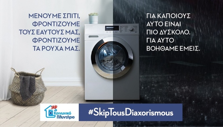 Ευτυχώς, το Κοινωνικό Πλυντήριο Skip συνεχίζει να προσφέρει δωρεάν τις υπηρεσίες του σε όσους έχουν ανάγκη, με τη λειτουργία του Κόμβου Αλληλοβοήθειας Πολιτών του Δήμου Αθηναίων. Επιπλέον, ανταποκρίθηκε άμεσα στην πρωτοβουλία του Δήμου Αθηναίων για τη δημιουργία νέων δομών αστέγων δωρίζοντας στεγνωτήρια, ενώ πρόσφερε και απορρυπαντικά στο Γηροκομείο Αθηνών και Καστοριάς αλλά και στο Γενικό Νοσοκομείο Καστοριάς. Το πιο σημαντικό όμως είναι ότι κάνει πράξη το μήνυμα #SkipTousDiaxorismous πρεσβεύοντας το δικαίωμα στο καθαρό ρούχο για όλους. Κεντρικό μέλημα παραμένει να βρίσκεται εκεί όπου υπάρχει η ανάγκη για καθαρό ρούχο, χωρίς διαχωρισμούς. Γι’ αυτό μέχρι σήμερα έχει προσφέρει 187.500 πλύσεις αγάπης και έχει πλύνει περισσότερους από 1500 τόνους ρούχων συνανθρώπων μας που βρίσκονται σε ανάγκη.