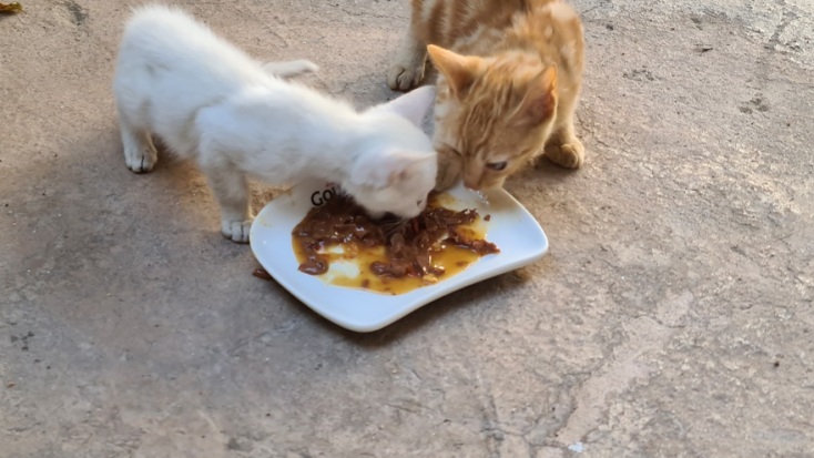 Δεν πρόλαβα καν να τα φωνάξω και άρχισαν να σπρώχνονται! Επιτέλους μπορούσα κι εγώ να φάω με την ησυχία μου. Τώρα αν με ρωτάτε ποιος ευχαριστήθηκε περισσότερο το γεύμα του, θα δυσκολευτώ να σας απαντήσω. Για ισοπαλία το κόβω...