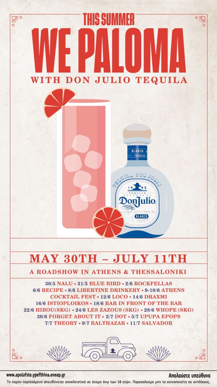 Φέτος, η Nο 1 premium tequila στο Μεξικό διοργανώνει το Don Julio Paloma Road show σε κορυφαία bars & high energy restaurants από 30 Μαΐου έως 11 Ιουλίου για να τιμήσει το πιο iconic, καλοκαιρινό cocktail, την Paloma με Don Julio tequila.