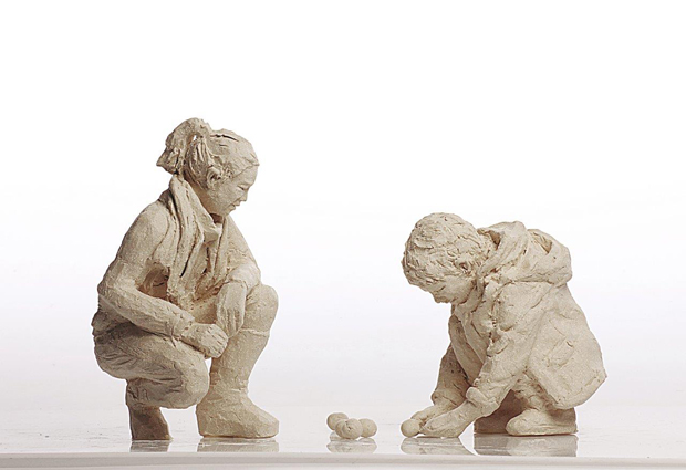 Η μοναξιά των μικρών ανθρώπων της Λένας Ζευγαρίδου είναι πηχτή και αδρή, σαν τον ωχρό ακατέργαστο ψημένο πηλό με το κουκούτσι των κόκκων της άμμου που τους γέννησε, σκαμμένη από τα σημάδια του μικρού μαχαιριού που τρύπωσε στο ελάχιστο δέμας τους. Την προσπερνάς στην αρχή, νομίζοντας ότι δεν είναι η δική σου, απολαμβάνοντας τη φίνα δυναμική και τη συνέργεια της επιτόπιας εγκατάστασης, παρατηρώντας κυρίως τη θαυμάσια χορογραφία του συνόλου, την ιδέα της μικρής αλλά σύνθετης κλίμακας και την έξοχη εκτέλεση αυτού του εύθραυστου και μετέωρου στην ισορροπία του πλήθους που ακροβατεί προς την ελευθερία απαλλαγμένο από εσωτερικά στηρίγματα και βάσεις.