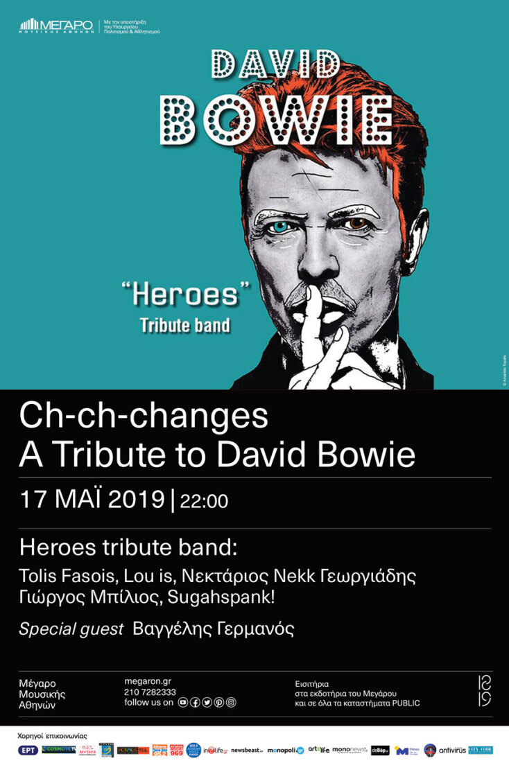 Το Ch-ch-changes είναι μία παράσταση - αφιέρωμα στον David Bowie και τις αλλαγές που συνέβησαν στην θαυμαστή, καλλιτεχνική του πορεία. Ένα πολυσυλλεκτικό μουσικό σχήμα, η Heroes Tribute Band, ειδικά δημιουργημένη για να ερμηνεύσει το τεράστιο έργο του Bowie, θα μας ταξιδέψει σε μερικούς από τους σημαντικότερους σταθμούς στην καριέρα του Starman, φωτίζοντας μερικά από τα highlights αυτής, μέσα από τα πολλά πρόσωπα του καλλιτέχνη.