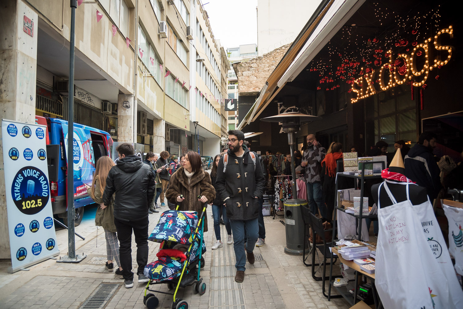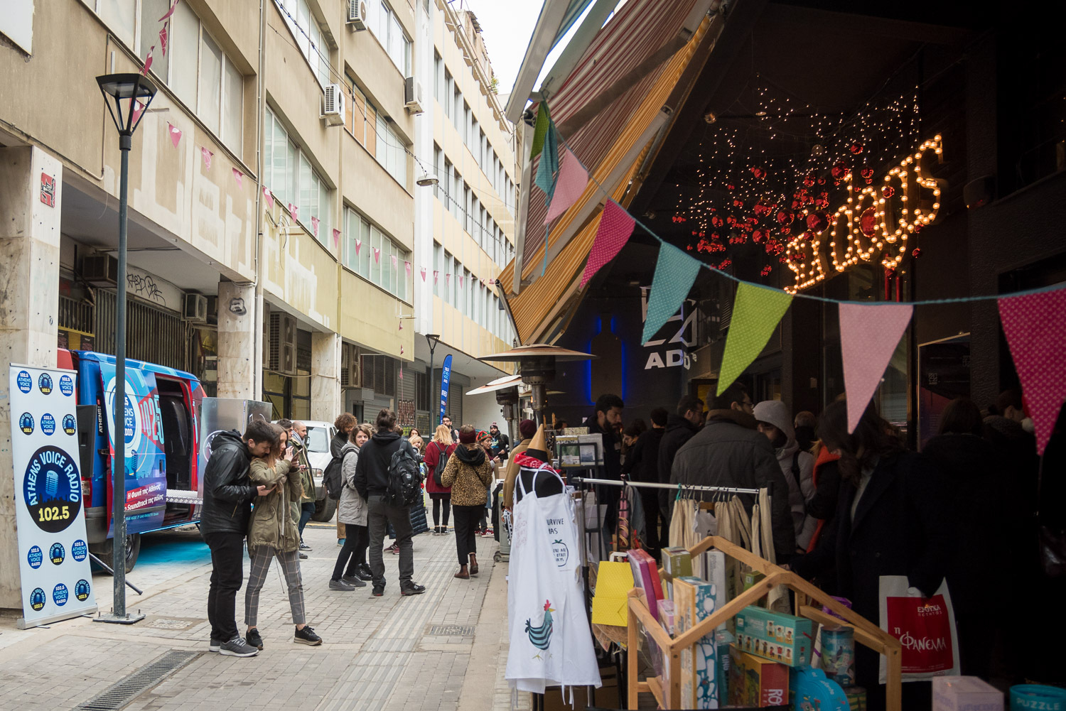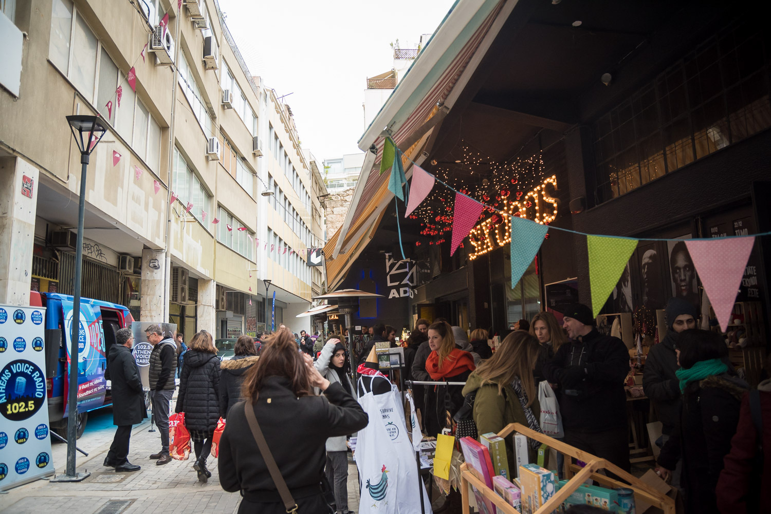 Μοναδικά χειροποίητα κοσμήματα, ρούχα, παιχνίδια και πολλά ακόμα κομψοτεχνήματα από 40 και πλέον εκθέτες έγιναν ξεχωριστά δώρα στο όμορφο shopping party που έζησε το κέντρο της πόλης. Κοκτέιλ πριν το ρεβεγιόν και ζωντανές εκπομπές από το Athens Voice Radio 102.5 που βγήκε από το στούντιο και πάρκαρε με το ειδικά διαμορφωμένο βαν του στον πεζόδρομο της Αβραμιώτου εκπέμποντας ζωντανά.