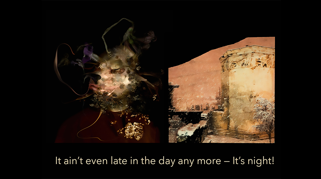 Ο Φίλιππος Τσιτσόπουλος εμπνέεται από τη μπαρόκ τέχνη και το μανιερισμό, αλλά και από το διαχρονικό ρεπερτόριο του δυτικού θεάτρου, δημιουργώντας χαρακτήρες πρωταγωνιστές. Στο έργο του έντονα ψυχογραφικές εικόνες ισορροπούν τέλεια μεταξύ του όμορφου και του τρομακτικού. Στην έκθεση It ain’t even late in the day anymore — Ιt’s night! παρουσιάζει το βίντεο από το μονόπρακτο του Τένεσσι Ουίλιαμς Το τελευταίο από τα ολόχρυσα ρολόγια μου, από το όποιο είναι δανεισμένος και ο τίτλος της έκθεσης, καθώς και φωτογραφίες - ψηφιακά κολάζ όπου παρουσιάζονται οι τρεις πρωταγωνιστές του έργου σε μορφή κωμικής αφίσας πλανόδιου θιάσου. Στα μπαρόκ αυτά πορτραίτα του Τσιτσόπουλου, η προβολή του παρελθόντος συμπεριλαμβάνει την αποτυχία, την αλλαγή ενός κόσμου αλλά και την λυτρωτική επαναφορά αυτού μέσα από την ομορφιά του χιονιού και του γκροτέσκ χιούμορ.
