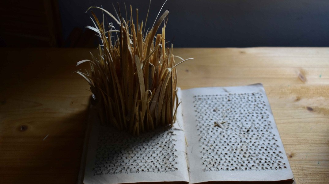 Ο καλλιτέχνης λαξεύει, πλέκει υφαίνει, καρφώνει ή ξεφλουδίζει σώματα ύλης, αποκαλύπτοντας ένα νήμα νοήματος που διαπερνά όλο το έργο του. Το ξύλο, το καλάμι, το φύλλο χαρτιού, το σώμα ενός βιβλίου, οι λέξεις που σφυρηλατούνται και γίνονται σκόνη, στρόβιλος ή πηγή που αναβλύζει συνυπάρχουν αρμονικά με θραύσματα από κορμούς δέντρων, χοάνες και μαγικά τοτέμ.