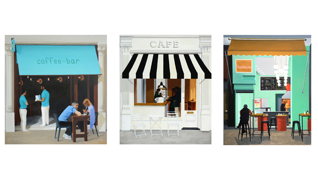 Στην ενότητα αυτή έργων του ο καλλιτέχνης εμπνέεται από τον μαγικό κόσμο των μαγαζιών της πόλης. Οι διαφορετικές προσόψεις τους, τα χρώματα, οι φωτεινές επιγραφές αλλά και το προσωπικό και ο κόσμος που συχνάζει και τους δίνει ζωή, ενίοτε και τα εσωτερικά τους, του κεντρίζουν το ενδιαφέρον και τον ωθούν στο να τα αποτυπώσει με ζωντάνια και αμεσότητα στον καμβά του. Συνδυάζει ζωγραφικά τα έντονα φωτεινά χρώματα που συνδέονται περισσότερο με την παλέτα των Ποπ καλλιτεχνών, με την πιο κλασική αναπαραστατική απεικόνιση που έχει πηγή έμπνευσης στους σπουδαίους εκπροσώπους της γενιάς του ’30 και του ’60. Η απλότητα που χαρακτηρίζει τις ζωγραφικές του αφηγήσεις συνάδει με τις εικόνες – τα μέρη: κτήρια, καφενεία, bar, η αγορά, το χασάπικο, το ιχθυοπωλείο κλπ, όλ’ αυτά αποτελούν πηγή έμπνευσής του. Παρατηρεί και καταγράφει τα απλά αυτά καταστήματα που συναντά κανείς σε μια βόλτα του στην πόλη με ένα μαγικό ρεαλισμό που μοιάζει σαν να βγαίνουν από ταινία. Αποτυπώνει με τον χρωστήρα του τις βιτρίνες τους, την αρχιτεκτονική, τα χρώματα, τα σχήματα, τη ζωή την κίνηση που υπάρχει γύρω τους μια συγκεκριμένη χρονική στιγμή. Τον ενδιαφέρει η καταγραφή του σήμερα, καθώς το κατάστημα δεν παραμένει πάντα με την ίδια πρόσοψη, αποτυπώνει λοιπόν τη δεδομένη χρονική στιγμή τον μικρόκοσμο αυτόν που δίνει την πνοή, την κίνηση, το στίγμα μιας πόλης και γίνεται το σημείο συνάντησης διαφορετικών ανθρώπων.