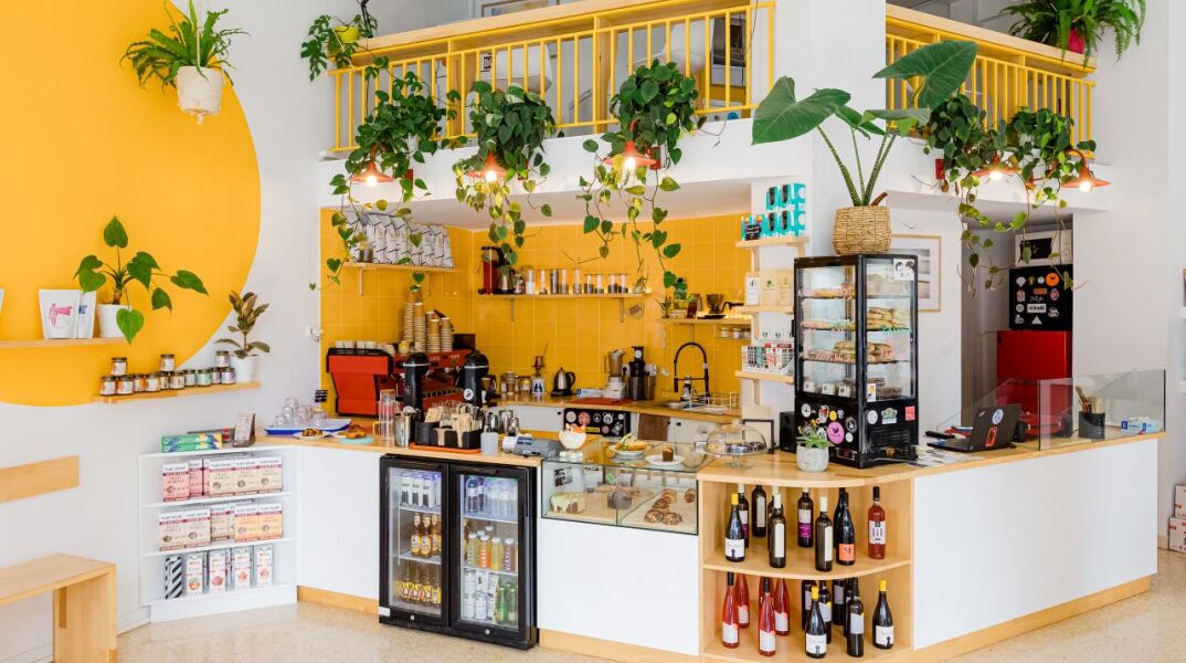 Cafe/bars BRU Μοντέρνο, με λουλούδια και διάφορες ανοιξιάτικες πρασινάδες στον εξωτερικό του χώρο, το BRU